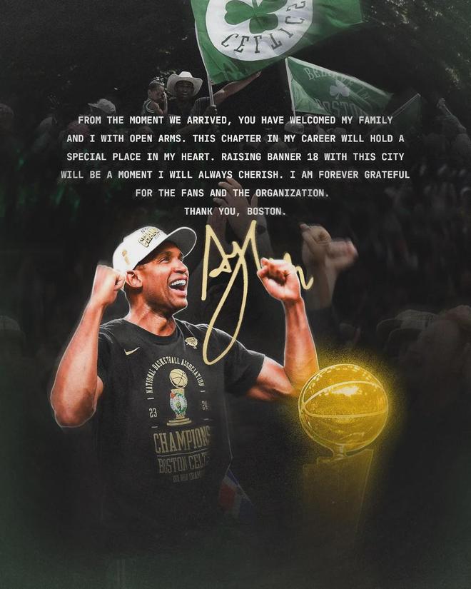 与此同时,霍福德也是发文告别凯尔特人:波士顿的球迷像对待家人一样接纳了我,这一篇章永远在我的职业生涯中占据特殊位置,我永远珍视与这座城市一起夺得的第18冠,谢谢你,波士顿!